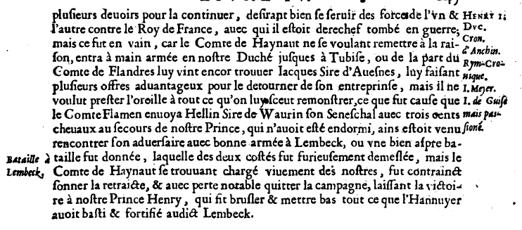 (Le) Comte de Hainaut se trouvant chargé vivement des nôtres, fut contraint de donner la retraite, et, avec perte notable quitter la campagne, laissant la victoire à notre Prince Henry, qui fit brûler et mettre bas (raser) tout ce que l’Hainuyer avait bâti et fortifié à Lembecq.